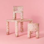 Young girl sitting on a floral-patterned stool against a pink background