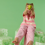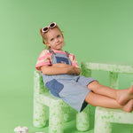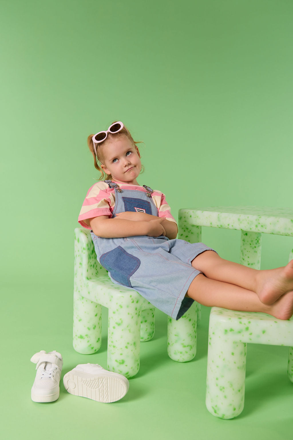 Child wearing sunglasses and a striped shirt with overalls standing on a green background